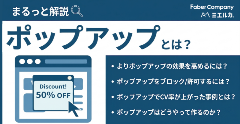 ポップアップ(pop-up)は、Webサイトの閲覧中に自動的に表示されるウインドウ(小窓)です。マーケティングで用いられるものは「ポップアップ広告」と呼ばれます。本記事では、ポップアップの意味や、利用のメリットとデメリット、実際にポップアップを使ってコンバージョン率がアップした事例などをご紹介します。
