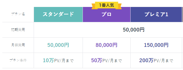 プラン条件 | 10万PV/月まで | 50万PV/月まで | 200万PV/月まで | 500万PV/月まで | |