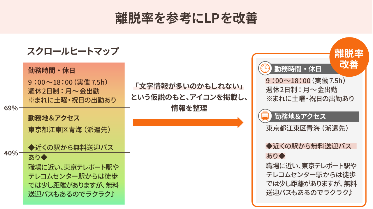 立てた仮説は、「求人サイトの原稿を参考に文字情報のみを掲載しているため、分かりづらく、離脱につながっているのではないか」ということ。アイコン掲載などのデザイン性を持たせ、情報を整理したことで、離脱率が改善されたという。この改善例は成功事例として、同企業の他の応募LPにも反映している。