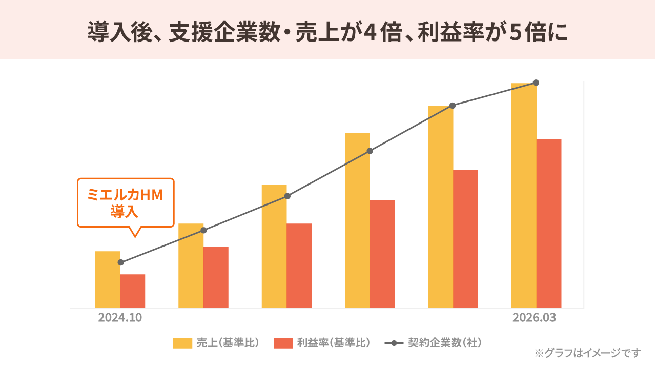 - 導入から1年半で、支援先企業数・売上が約4倍、利益率5倍