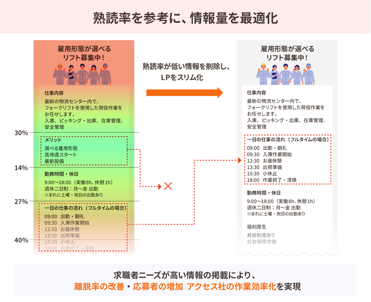熟読率が低い情報を削除し、LPをスリム化。求職者のニーズが高い情報に絞り込むことで、離脱率の改善・応募者の増加につながっている。さらに、LPのスリム化により、制作・更新にかかる工数も削減でき、作業効率化にも寄与しているという。