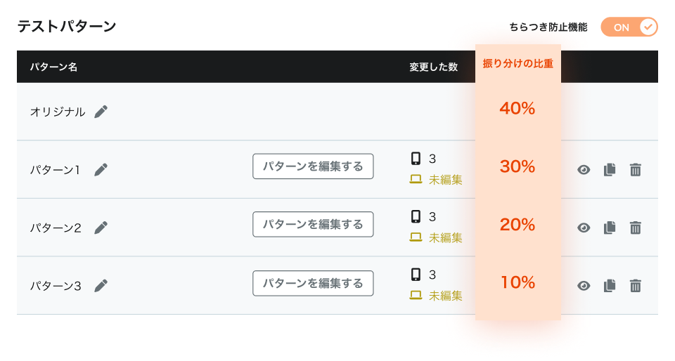 改善案が本当に効果を発揮するのかどうかを実装前に検証。ノーコードで簡単に編集ができるほか、結果がよかったパターンの100%配信も可能!