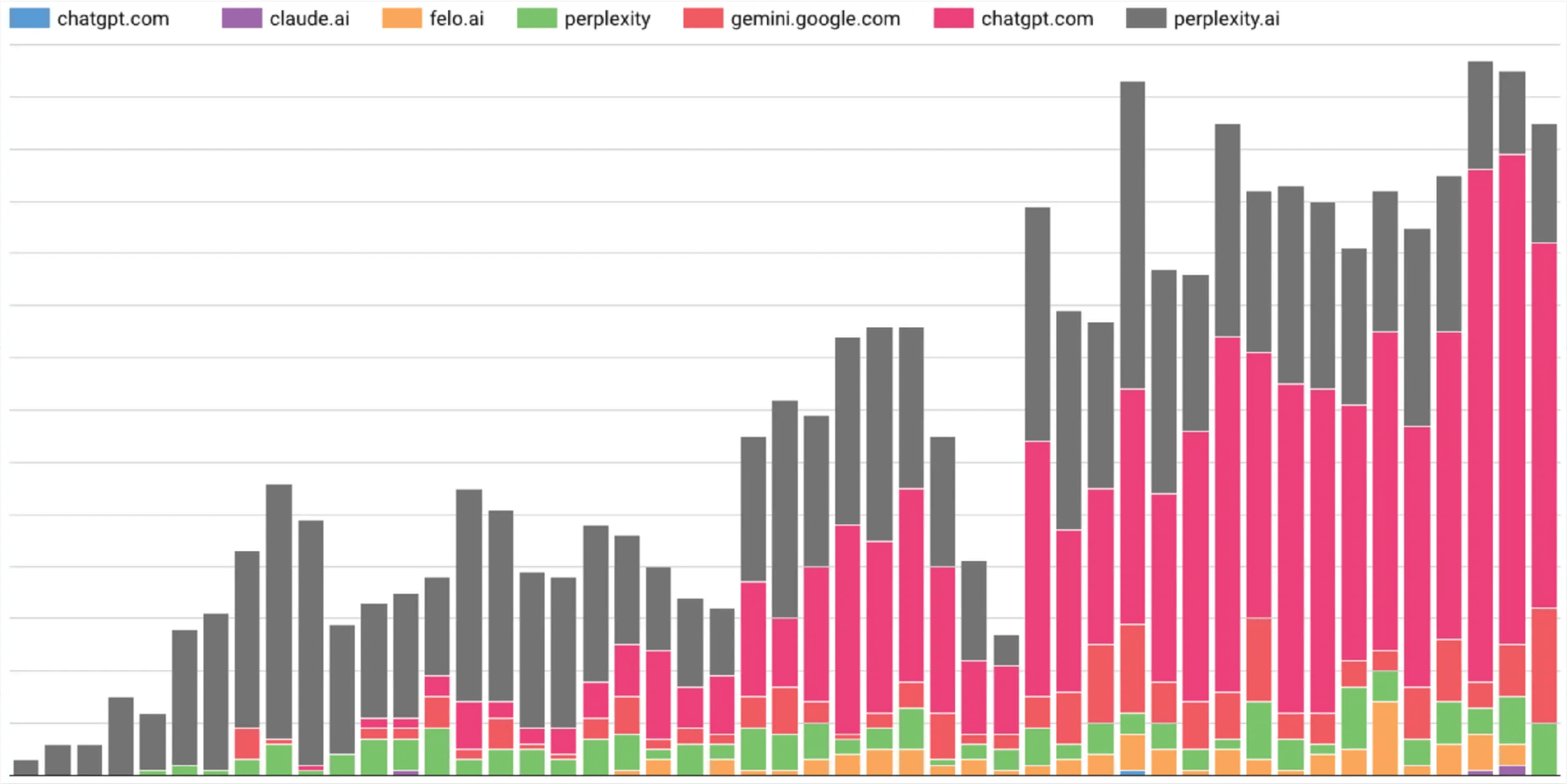 当社観測の某サイトでの各AIプラットフォーム経由での流入推移(期間:2024/5/1~2025/4/30)